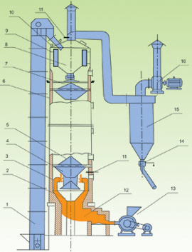 1、提升机 2、下料漏斗 3、导热管 4、滑料盆 5、散料锥 6、耐热保温层 7、截流装置 8、料仓 9、预热管道 10、智能料粒仪 11、预热仪 12、热风炉 13、喷煤机 14、料阀 15、收尘器 16、风机。